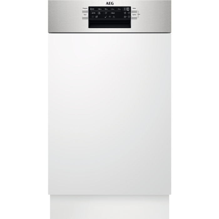 Umývačka riadu - s panelom 45 cm; AEG Mastery FEE73407ZM; Šírka (cm): 45; Technológia: airdry; En.trieda: D; Počet sád: 9; Počet programov / teplôt: 9/4; Spotreba vody (l): 9.9; Hlučnosť (dB): 44; Satelitné rameno: Áno; Príborová zásuvka: Nie; SoftGrips: 2; Vnútorné osvetlenie: Nie; Rozmery VxŠxH (mm): 818x450x550; Motor: Invertor motor