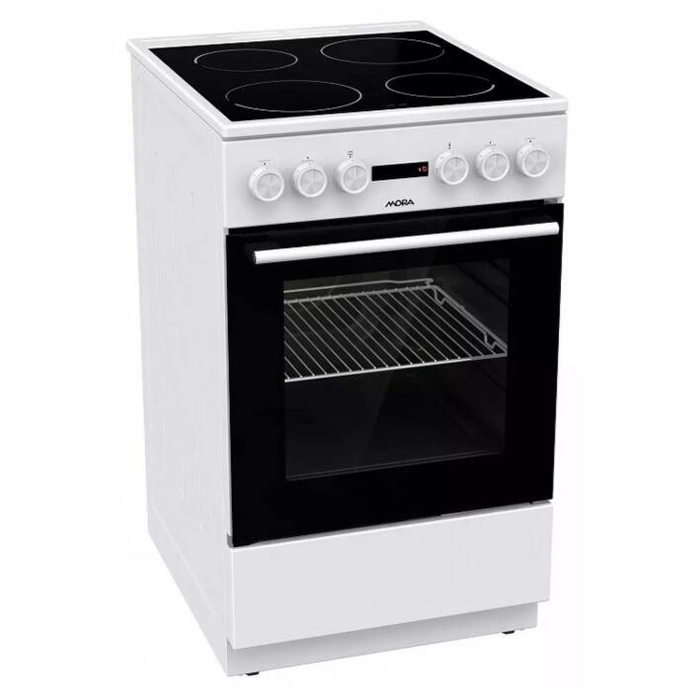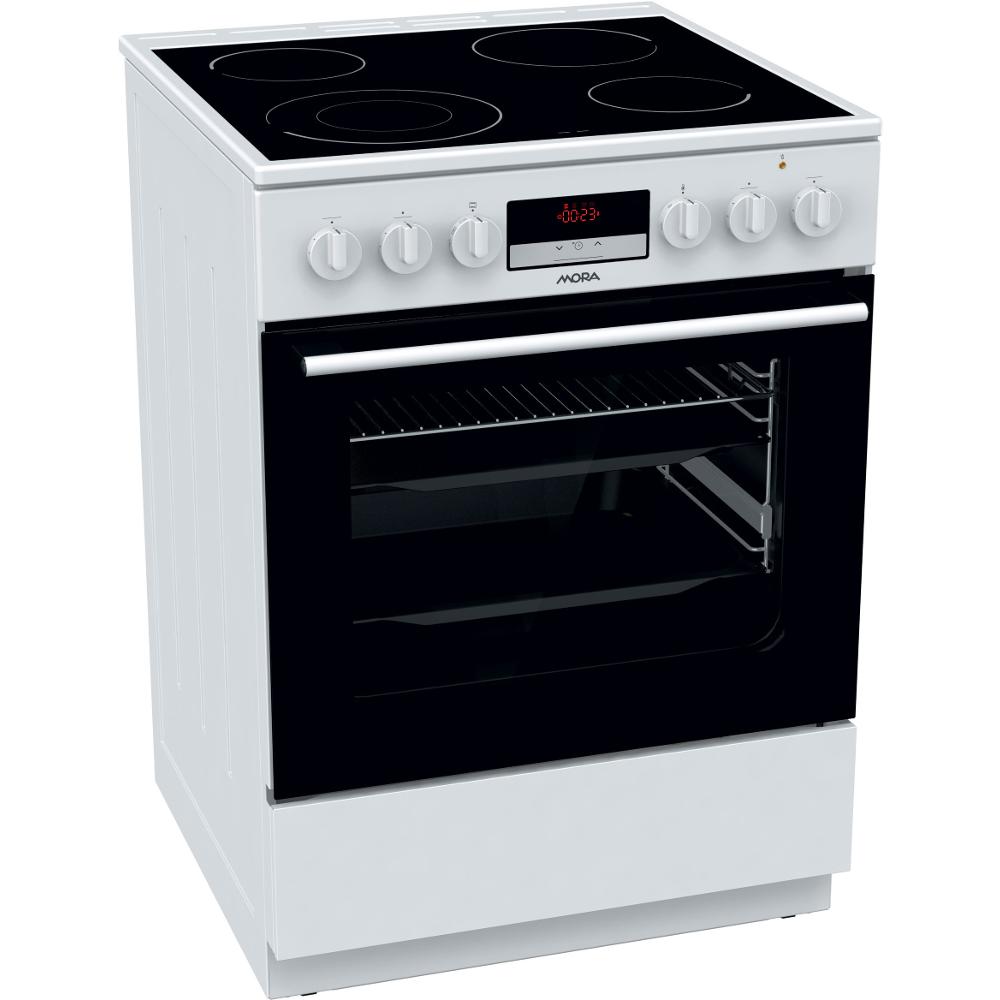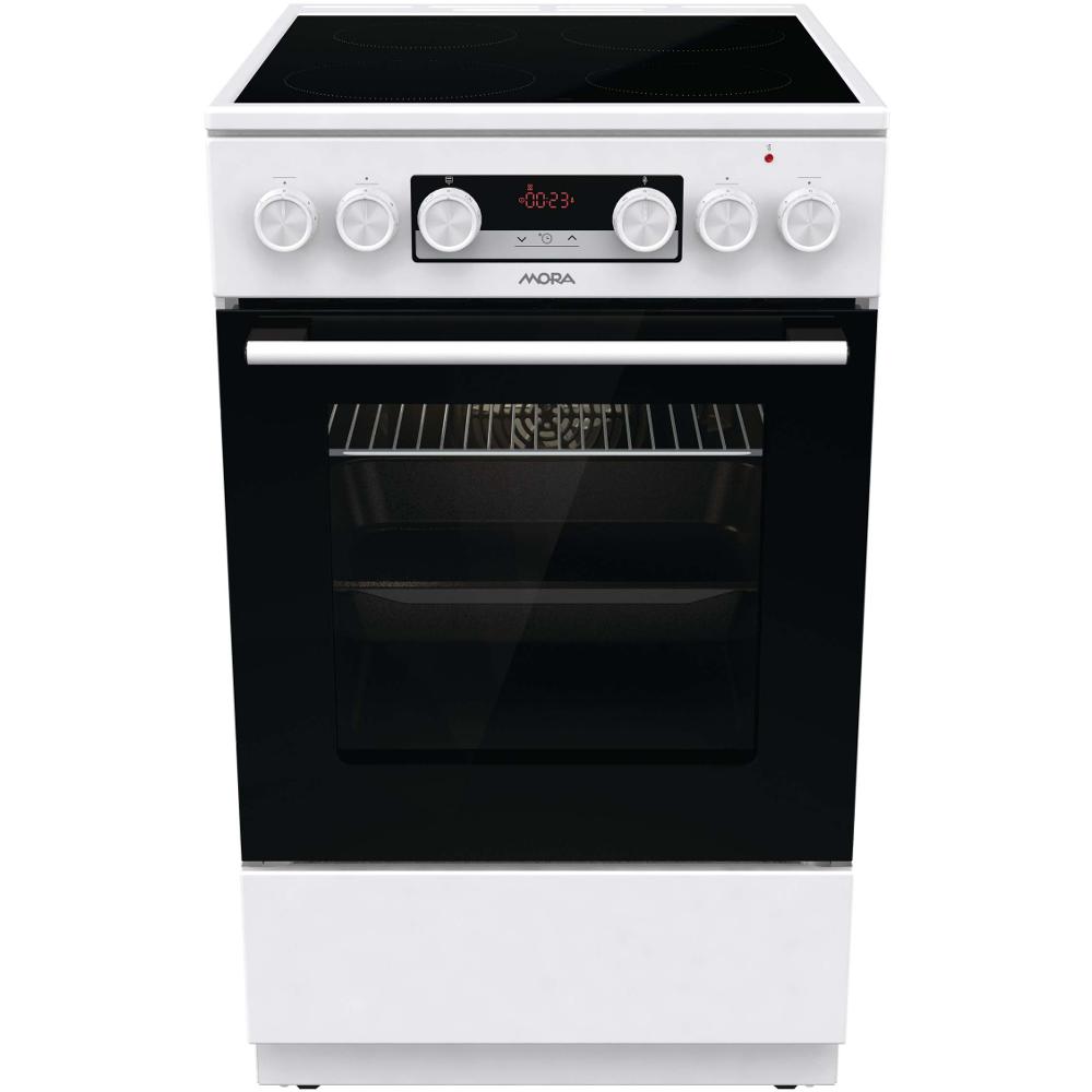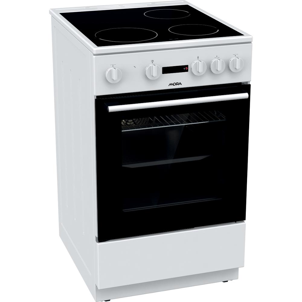 Sporák E50 Mora C 5242 CW, Elektrický sporák s multifunkčnou rúrou, biela farba, sklokeramická doska, 4 HiLight varné zóny, vľavo vpredu Ø 18 cm, 1,7 kW, vpravo vpredu Ø 14,5 cm, 1,2 kW, vľavo vzadu Ø 14,5 cm, 1,2 kW, vpravo vzadu Ø 18 cm, 1,7 kW, ukazovateľ zvyškového tepla