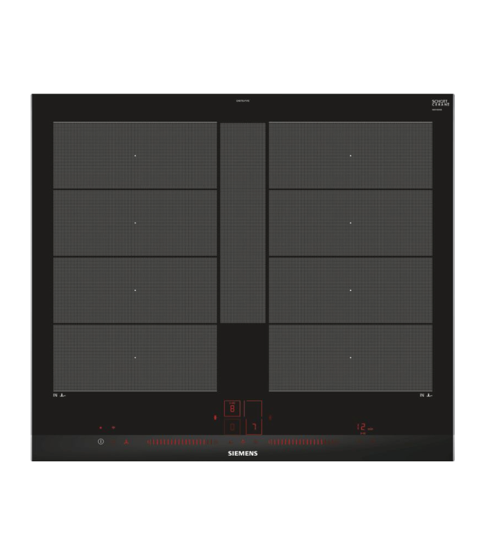 Indukčná varná doska; Siemens EX675FEC1E; šírka 60 cm, 4 indukčné varné zóny, z toho 1 FlexZone a 2 kruhové varné zóny, ovládanie touchSlider, fryingSensor, powerBoost, detská poistka, 2-stupňový ukazovateľ zostatkového tepla pre každú varnú zónu, príkon: 7,4 kW, fazetový dizajn - antikoro