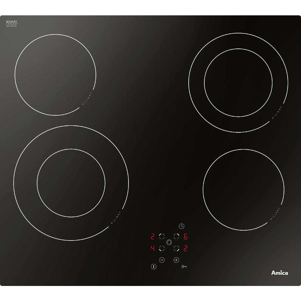 Sklokeramická vstavaná platňa, nerezový rámček, dotykové ovládanie výkonu, 4 Hi–Light varné zóny, 1x duozóna 120/210 mm 0,8/2,2 kW, 2x 145 mm 1,2 kW, 1x 180 mm 1,8 kW, ukazovateľ zvyškového tepla, plynulá regulácia výkonu, signalizácia funkcie, KeepWarm (udržiavanie teploty 70 °C), Pause (okamžité dočasné zastavenie varenia bez straty nastavených parametrov),