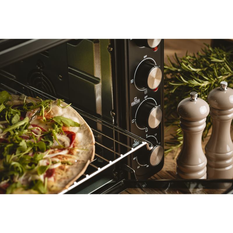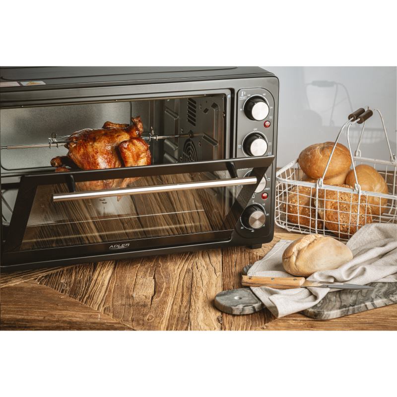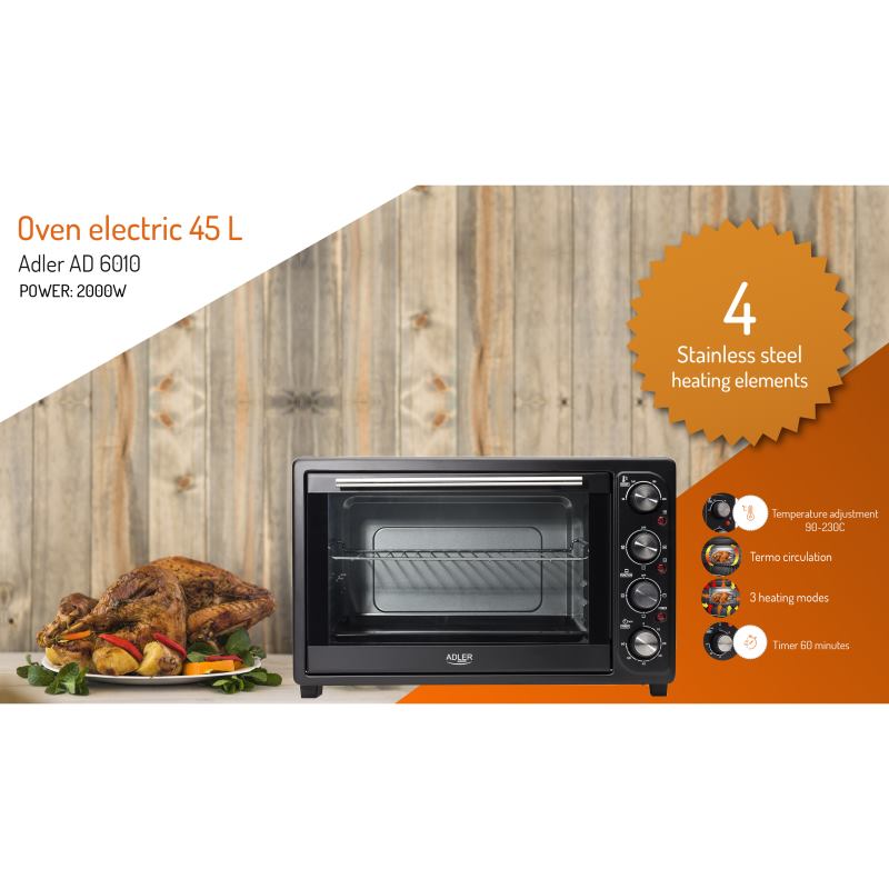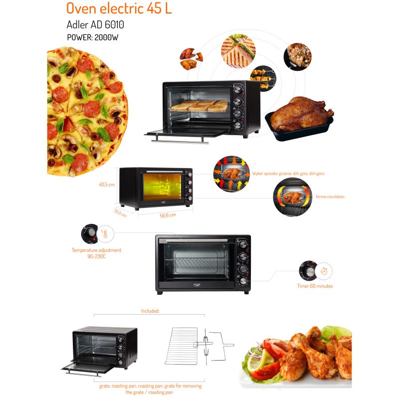 Kvalitná elektrická rúra s roštom a plechom na pečenie. Umožňuje prípravu pečeného mäsa, koláčov, kastrólov a iných jedál, ktoré vyžadujú vysokú teplotu. Rúra umožňuje zvoliť si typ ohrevu ? zhora alebo zhora aj zdola. Vykurovacie telesá sú vyrobené z odolnej nehrdzavejúcej ocele, čo zaisťuje ich odolnosť a spoľahlivosť. Vďaka časovaču je používateľ informovaný o uplynutí konkrétneho času. V dôsledku toho je menšia šanca, že sa jedlo pripáli. Rúra AD 6010 má veľkú kapacitu, ktorá umožňuje pripravovať veľké porcie alebo piecť dva produkty súčasne.