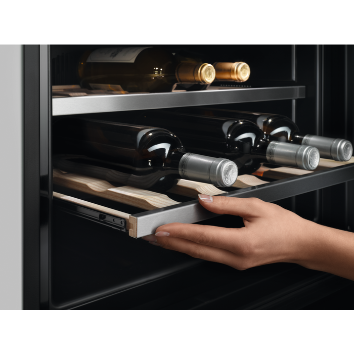 Táto vinotéka má elegantný dizajn a funkčný dizajn. Namiesto držadiel sa otvára ľahkým zatlačením. Navyše dizajnovo bude ladiť s ostatnými kuchynskými spotrebičmi AEG Mastery.