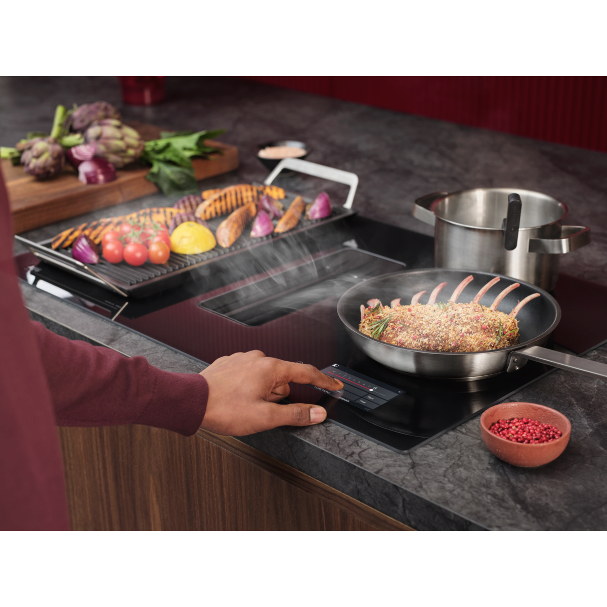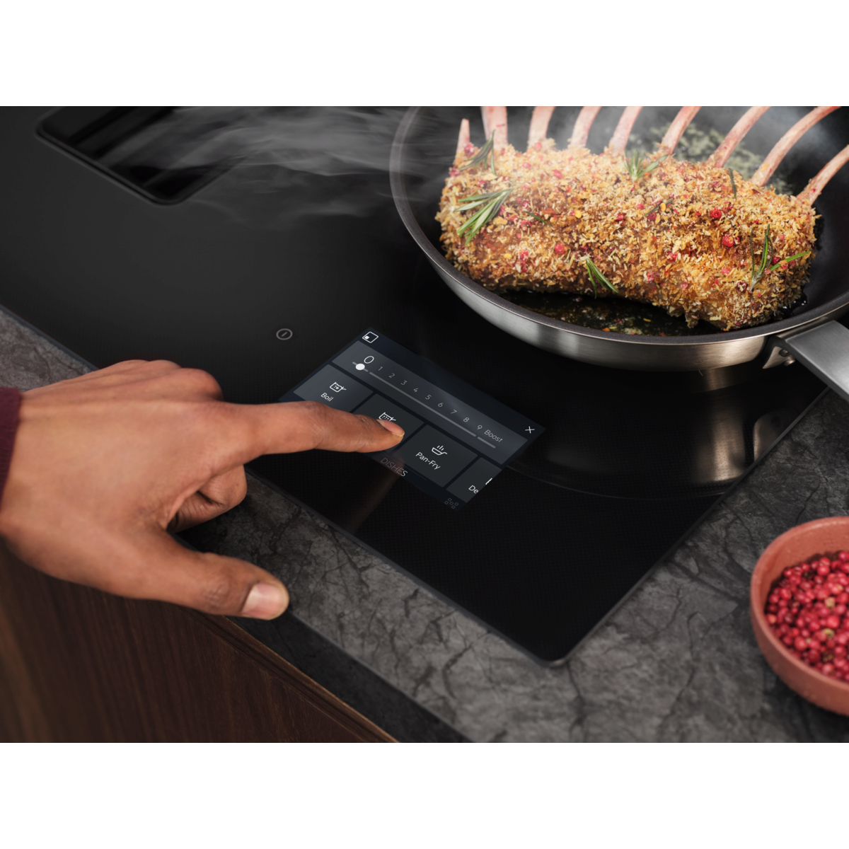 Varná doska s SensePro Extractor je vybavená bezdrôtovou teplotnou sondou pre kulinársku precíznosť. Sonda meria presnú teplotu v strede potraviny a automaticky upravuje nastavenia pre dokonalú chuť a štruktúru. Varte, smažte, pripravujte metódou sous- vide a inými spôsobmi. Vždy lahodný výsledok.