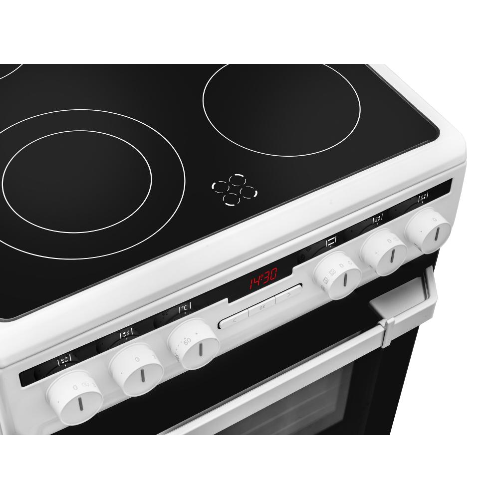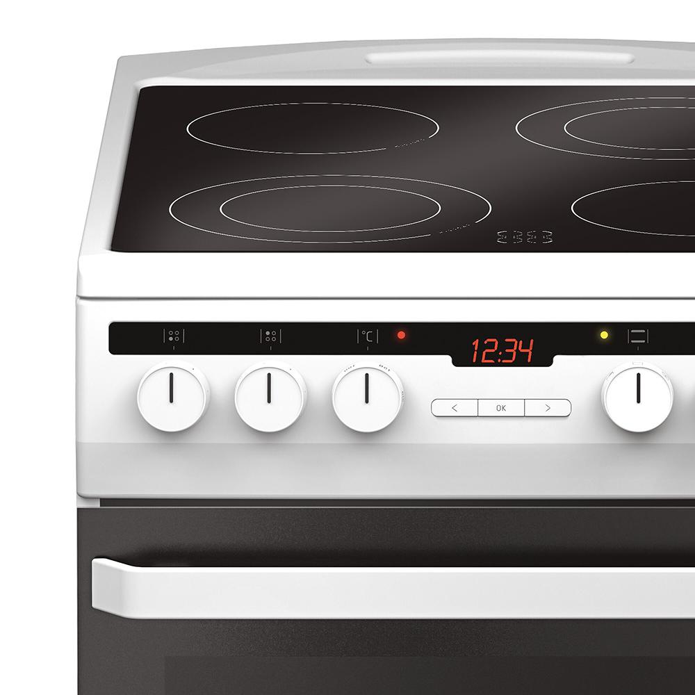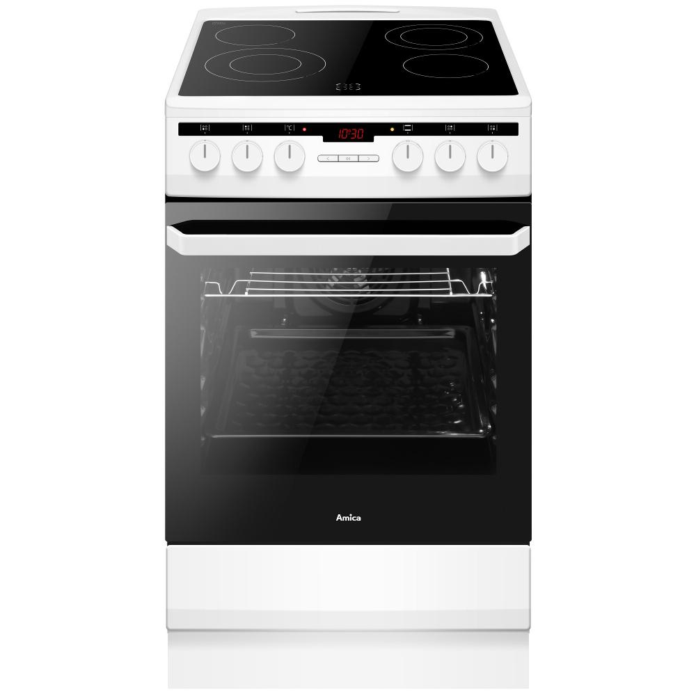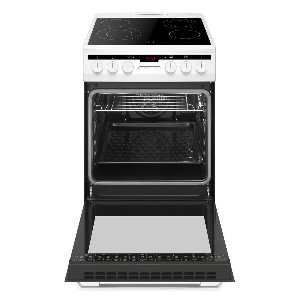 VLASTNOSTI, Energetická trieda A, Varná doska: sklokeramická, Digitálny displej, Elektrická rúra multifunkčná, TECHNICKÉ PARAMETRE, Počet funkcií rúry: 10, Super rýchly ohrev 150 ° C za 4 min. 30 s, Ľahko čistiteľný smalt vnútri rúry, Zvyškové ukazovatele tepla, Počet skiel dverí rúry 3, Výsuvný odkladací priestor, Objem rúry: 63 l, Gril: 2000 W, Horné výhrevné teleso 900 W, Spodné výhrevné teleso 1300 W, Zadné kruhové výhrevné teleso 2000 W, HiLight zóna 14 cm (1,2 kW). 2x, HiLight Duálna zóna 12/18 cm (1,7 kW). 2x, Príkon: 8,9 kW, ROZMERY A PRÍSLUŠENSTVO, Hlboký plech na pečenie. 1x, Rošt. 1x, Farba: Biela, Rozmery: (V x Š x H) 85 x 50 x 60 cm