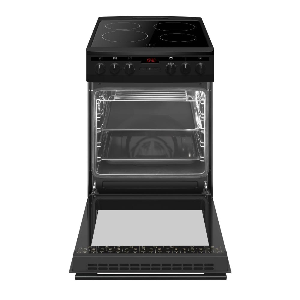Sklokeramický sporák 50 cm, Energetická trieda: A, Objem 65 l, Príkon 9,6 kW, Digitálny displej / Typ programátora Ta, Elektrická multifunkčná rúra, 11 funkcií rúry vr. grilu a horúceho vzduchu Rozmery:, Super rýchly ohrev, Ukazovatele zvyškového tepla, Gril 1500 W, Horné výhrevné teleso 900 W, Spodné výhrevné teleso 1100 W, Zadné kruhové výhrevné teleso 2100 W, Bočné závesné lišty plechov, Ľahko čistiteľný smalt vo vnútri rúry, Počet skiel dverí rúry 3, Soft Close – tlmené dovieranie dvierok, Výsuvný odkladací priestor, Sklokeramická varná doska 4 zóny, HiLight zóna 14,5 cm 1,2 kW 2x, HiLight duálna zóna 18 cm 1,8 kW 2x, Hlboký plech na pečenie, Plytký plech na pečenie, Rošt, Rozmery, Výška: 85 cm, Šírka: 50 cm, Hĺbka: 60 cm