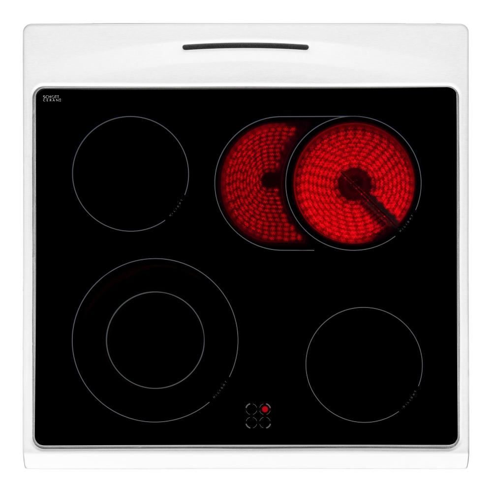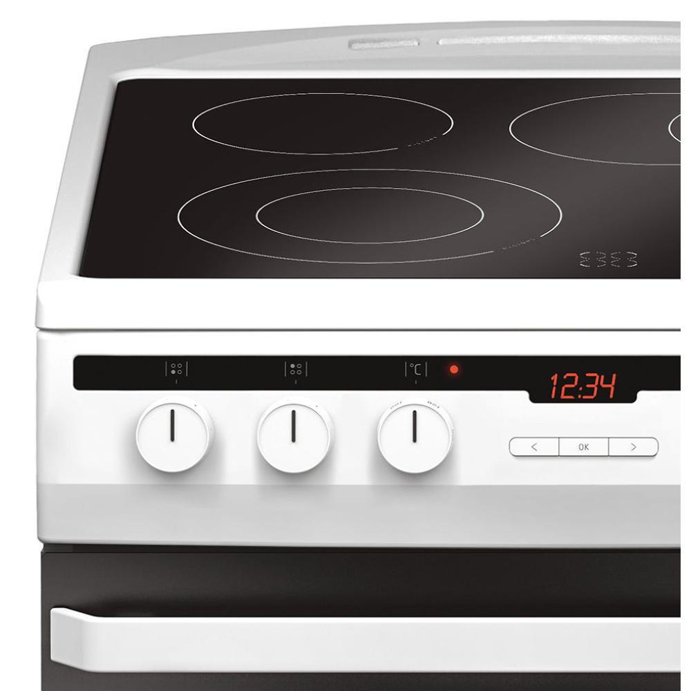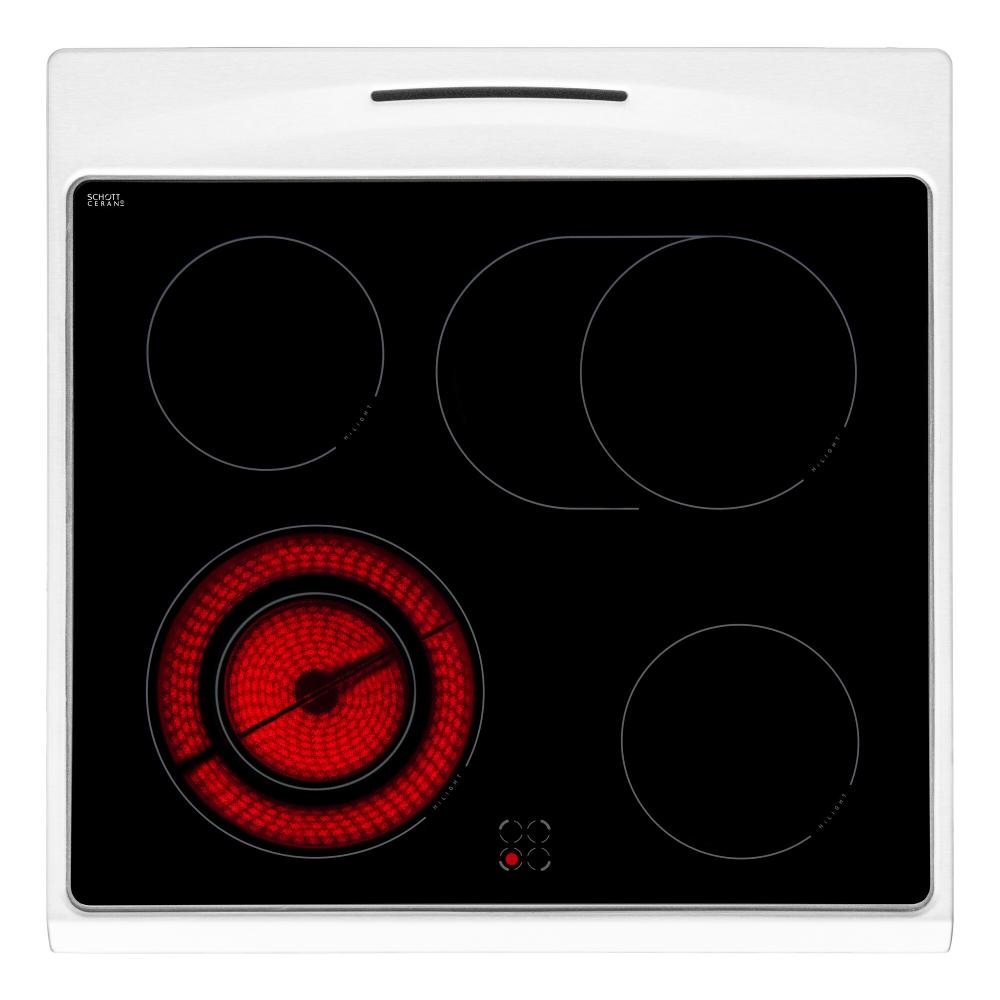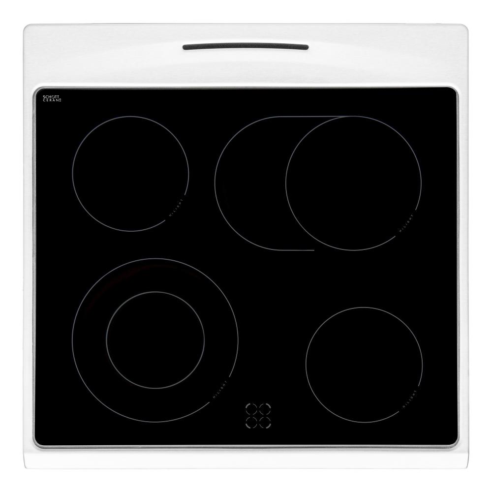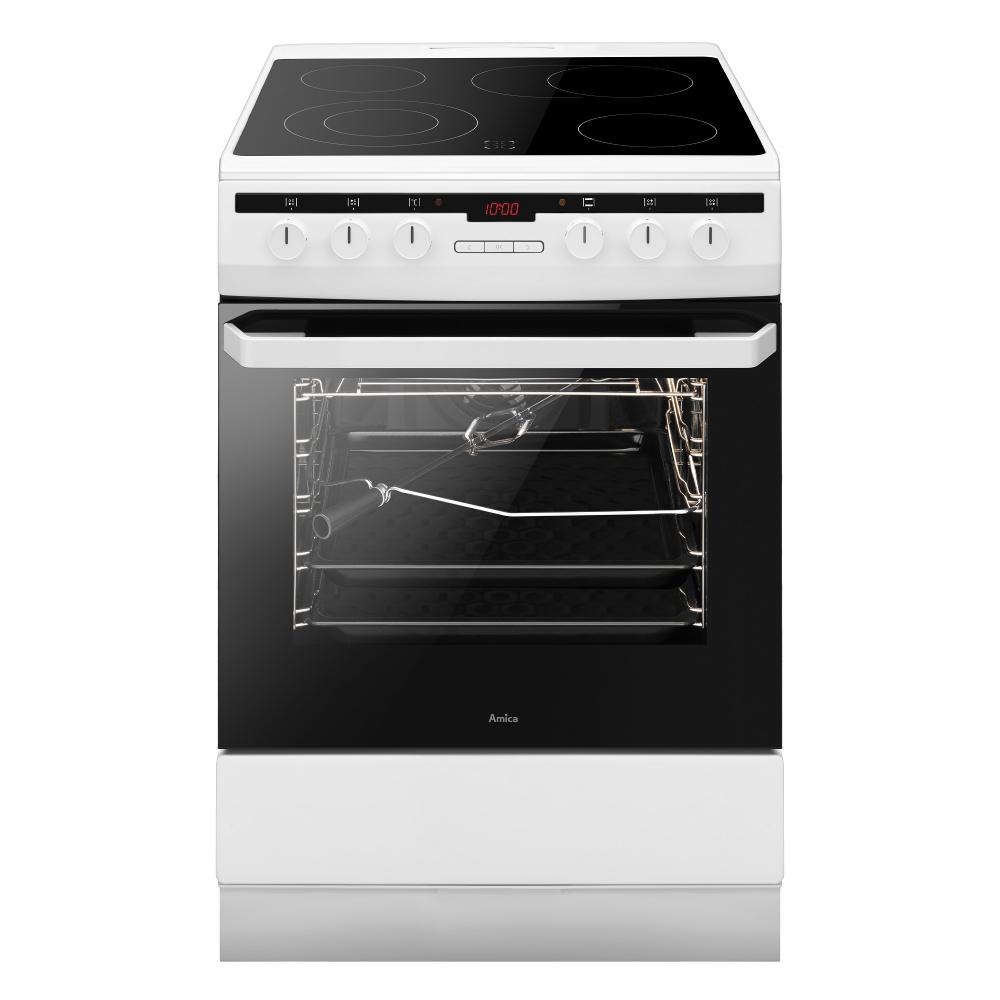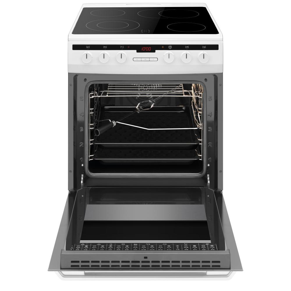 Voľne stojaci sporák so sklokeramickou doskou, Farba Biela, Výška 85 cm, Šírka 60 cm, Hĺbka 60 cm, Typ varnej dosky Sklokeramická, Energetická trieda A, Vnútorný objem rúry 65 l, Celkový príkon 9,9 kW, Horné výhrevné teleso 900 W, Spodné výhrevné teleso1100 W, Zadné kruhové výhrevné teleso 2000 W, Elektrický gril 2000 W, Počet varných zón/horákov 4 ks., Pripojenie k elektrickej sieti 400 V, Typ rúry: Elektrická, Počet funkcií: 10 funkcií rúry vr. horúceho vzduchu, Super rýchly ohrev, Tá programátor, Otočný ražeň, Výsuvný odkladací priestor, Katalytické samočistiace dosky, Počet plechov: 1, Displej, Typ predných dvierok: CoolDoor3