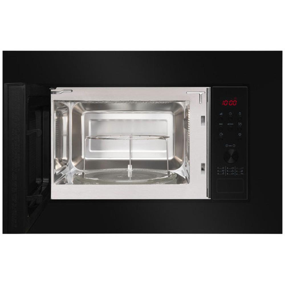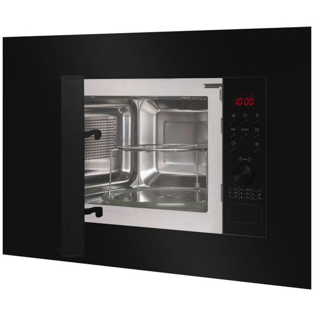 Mikrovlnná rúra vstavaná; Farba Čierna; Objem 20 l; Mikrovlnný výkon 700 W; Gril 900 W; LED displej; Elektronické ovládanie; 9 programov; 6 stupňov výkonu; Digitálna minútka 95 min.; Rozmrazovanie váhové automatické; Akustický signál ukončenia programu; Detská poistka; Maximálny priemer taniera: 24,5 cm; Vrátane rámčeka; Vnútorný priestor z nerezovej ocele;