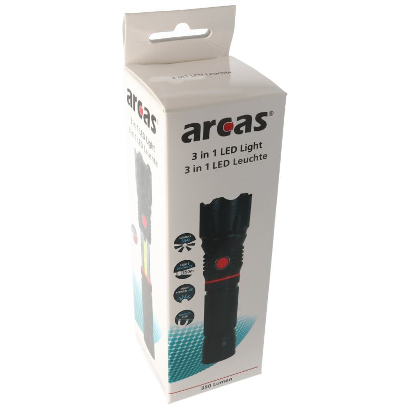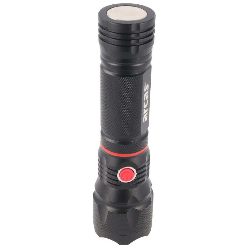 ARCAS 3v1 LED, Baterka, čierna (30700036) – Vybavená vysokovýkonnými LED diódami, čierne hliníkové vysúvacie puzdro je odolné voči nárazom a pri vysunutí sú viditeľné bočné COB LED diódy, ktoré majú funkciu bieleho LED stáleho svietenia a funkciu červeného LED blikajúceho svetla., extra silný magnet. Dosah osvetlenia je max 200m. Napájanie je prostredníctvom 4x AAA batérií (nie sú v balení a treba ich zakúpiť samsotatne)