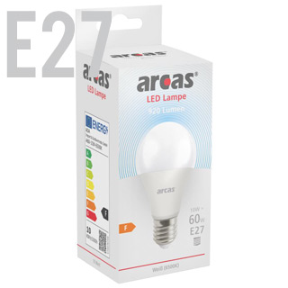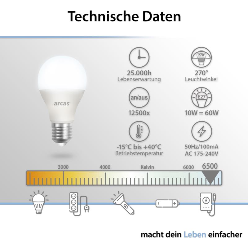 LED žiarovka ARCAS 10W s 6500 Kelvinmi zaisťuje denné svetlo bez blikania s prirodzeným podaním farieb. Výkon: 10W zodpovedá 60W žiarovke, Životnosť: 25 000 hodín, Napätie/frekvencia/menovitý prúd: AC 175-265V/50Hz/100mA, Prevádzková teplota: -15° – +40° C, Veľkosť pätice: E27, Stmievateľné: Nie, Svetelný tok (lúmeny): 931, Teplota farby: 6500K, Index podania farieb: >80Ra, Spínacích cyklov: 12 500, Trieda energetickej účinnosti: A+, Rozmery (priemer x L mm): 60 x 110,5, Čas spustenia: < 0,5 s, Svetelný uhol: 270°