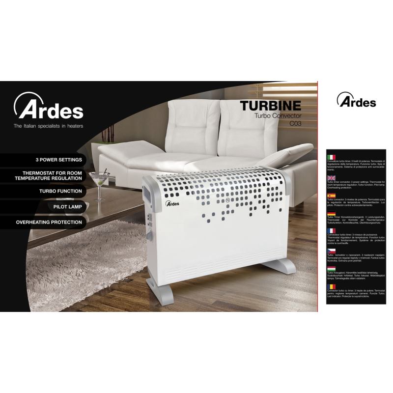 Samostatne stojaci moderný TURBO konvektor Ardes s možnosťou pripevnenia na stenu. Dokonalé prúdenie vzduchu pomocou systému AIR MIX. Veľké prieduchy vzduchu.Volitelnost 3 prevádzkových stupňov. Priestorový termostat 1800W. Vypnutia pri prevrhnutí. Rozmery VxŠxH 55x14x45 cm, váha 2 kg.