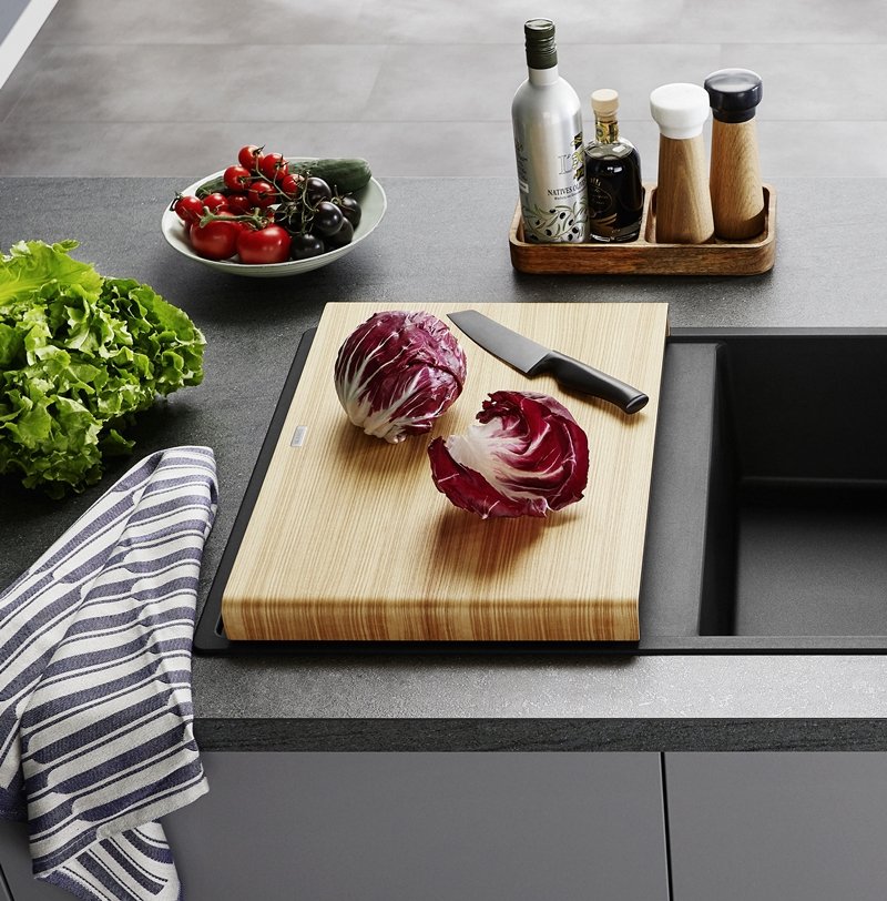 Kompozitná doska na krájanie z jaseňa, multifunkčná nerezová miska, odtoková armatúra, dve 3 ½“ InFino® výpuste so sitkami, excent. ovládanie pre hlavnú vaničku, zápachový uzáver s odbočkou pre umývačku riadu