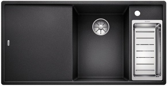 Kompozitná doska na krájanie z jaseňa, multifunkčná nerezová miska, odtoková armatúra, dve 3 ½“ InFino® výpuste so sitkami, excent. ovládanie pre hlavnú vaničku, zápachový uzáver s odbočkou pre umývačku riadu