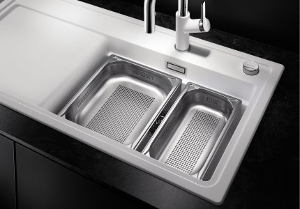 - rozličné príslušenstvo: doska na krájanie posúvateľná pozdĺž celého drezu, závesná multifunkčná miska atď.