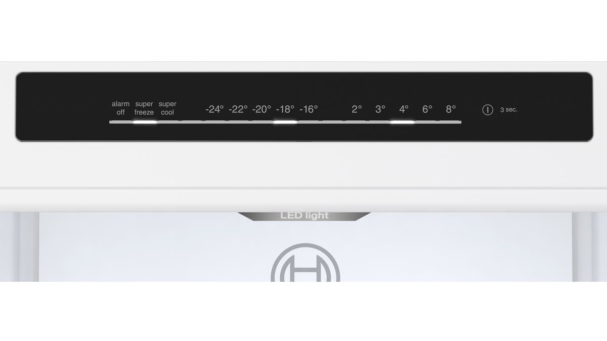 Skôr než sa vyberiete na nákup, môžete na krátky čas znížiť teplotu v chladničke pomocou funkcie super chladenia. Čerstvo nakúpené potraviny sa tak budú tešiť optimálnej teplote. Teplotu znížite jednoduchým stlačením tlačidla (2 °C na najnižšej úrovni). Aby ste predišli nadbytočnej spotrebe energie, funkcia sa automaticky prepne na pôvodnú po približne 6 až 15 hodinách. Ak je váš spotrebič navyše prepojený, funkciu super chladenia môžete nastaviť pomocou aplikácie Home Connect.
