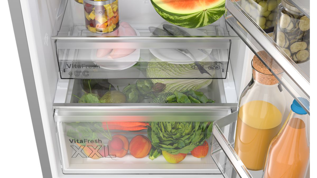 Priestranný systém VitaFresh XXL <0 °C> ponúka ideálne skladovacie prostredie pre čerstvé potraviny. Pri mäsových výrobkoch či rybách udržuje nižšiu teplotu, zatiaľ čo priehradka s reguláciou vlhkosti zachová ovocie a zeleninu skutočne čerstvé.