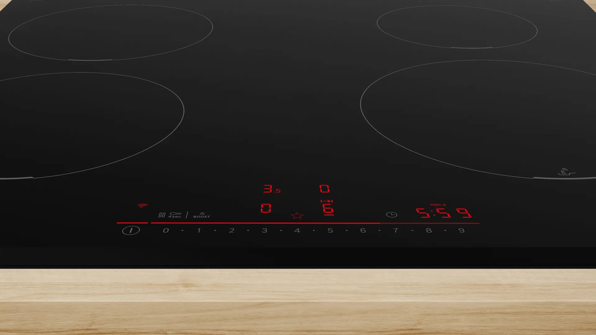 indukčná varná doska, 60 cm, 4 indukčné varné zóny, ovládanie DirectSelect+, PowerBoost, PerfectFry Plus, HoodControl, funkcia Assist, PowerBoost, detská poistka, 2-stupňový ukazovateľ zostatkového tepla pre každú varnú zónu, príkon: 7,4 kW, predná fazeta