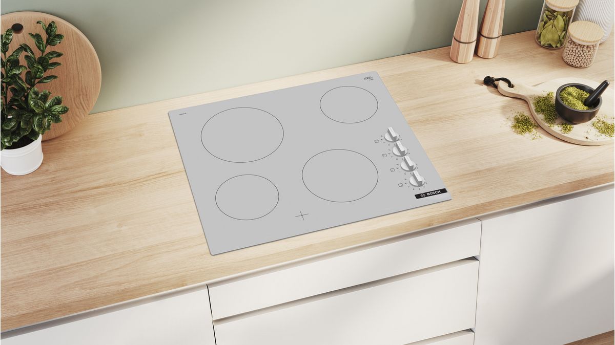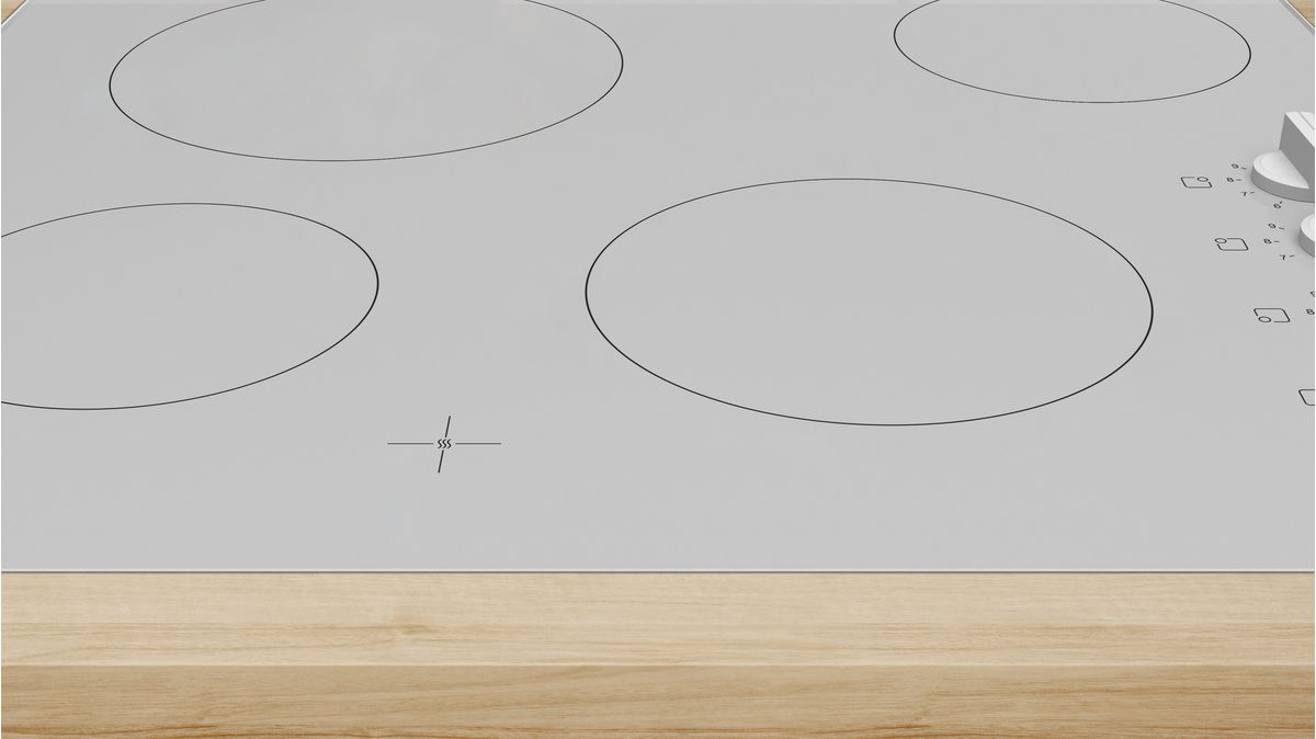 Elektrická varná doska, 60cm, 4 varné zóny, ukazovateľ zostatkového tepla pre každú varnú zónu, ovládanie bielymi otočnými gombíkmi, dizajn bez rámčeka – inštalácia na pracovnú dosku, biela