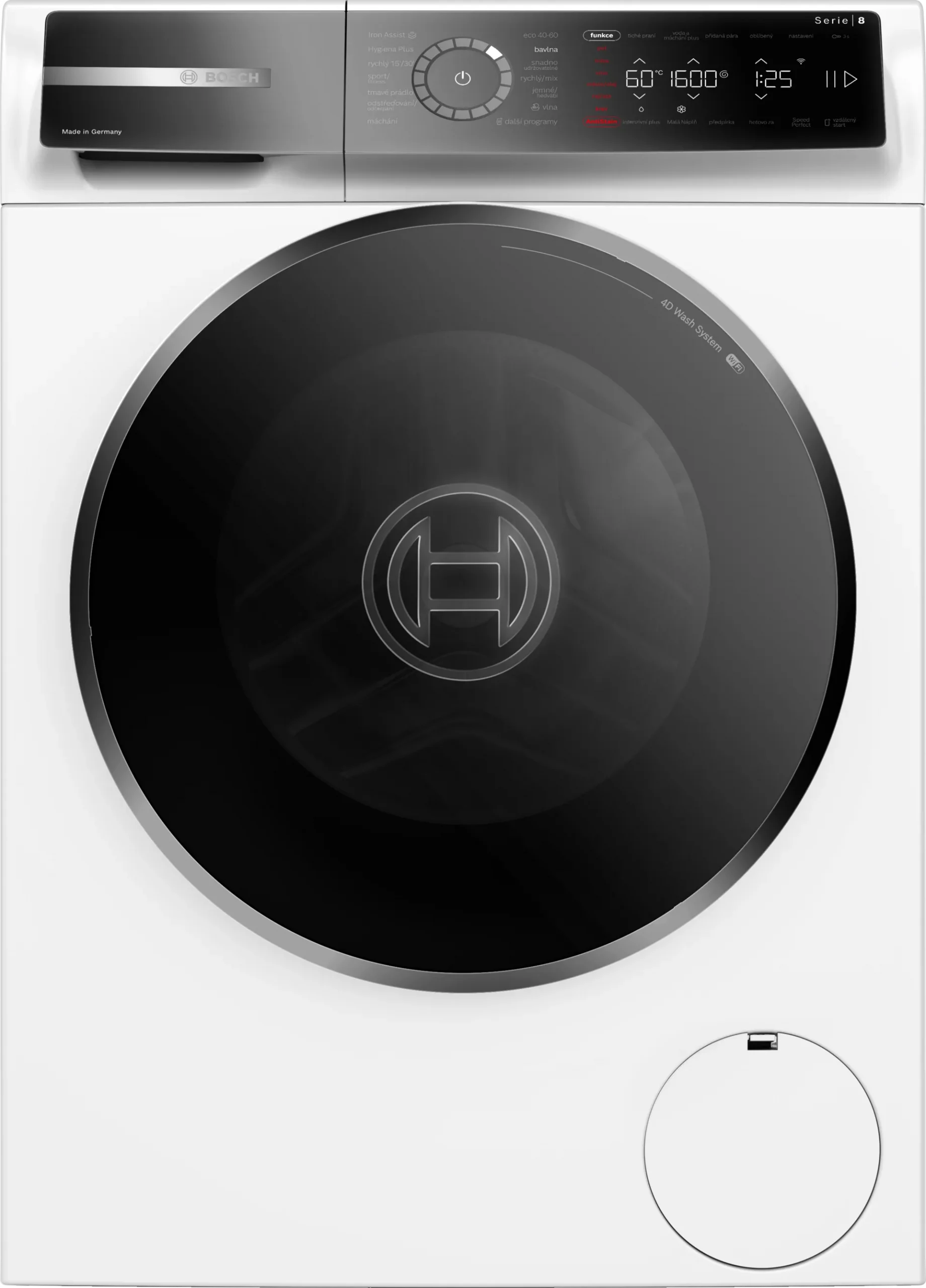 Iron Assist, A -30 %, max 1600 ot./min., obsah 10 kg, 4D Wash System, AquaStop, veľký naklonený LED displej, i-DOS 2.0, Vario Drum bubon s LED, Anti Stain systém, Eco Silence Drive motor, Speed Perfect, h 59 cm, 72 dB