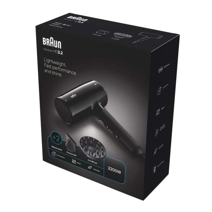 BRAUN HD225 Hairdryer HD2.2, Fén na vlasy, 2200W – S výkonom 2200 W a nízkou hmotnosťou tento fén zaisťuje naozaj rýchle a pohodlné vysúšanie vlasov. Vďaka ionizačnej technológii IONTEC dosiahnete oslnivý lesk a uhladenie krepatiacich sa vlasov. Ponúka 3 nastavenia teploty a tlačidlo studeného vzduchu pre fixáciu účesu. Praktický dizajn umožňuje namotávanie kábla s dĺžkou 1,95 m na telo prístroja. Odnímateľný zadný filter na jednoduché čistenie. V balení nájdete difuzér na zvýraznenie prirodzených kučier a koncentrátor na presný styling a uhladzovanie vlasov. Ovládanie pomocou jednoduchých posuvných tlačidiel.