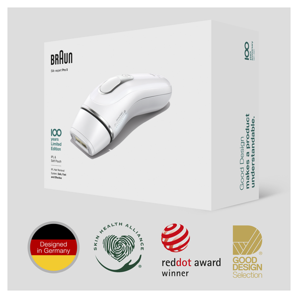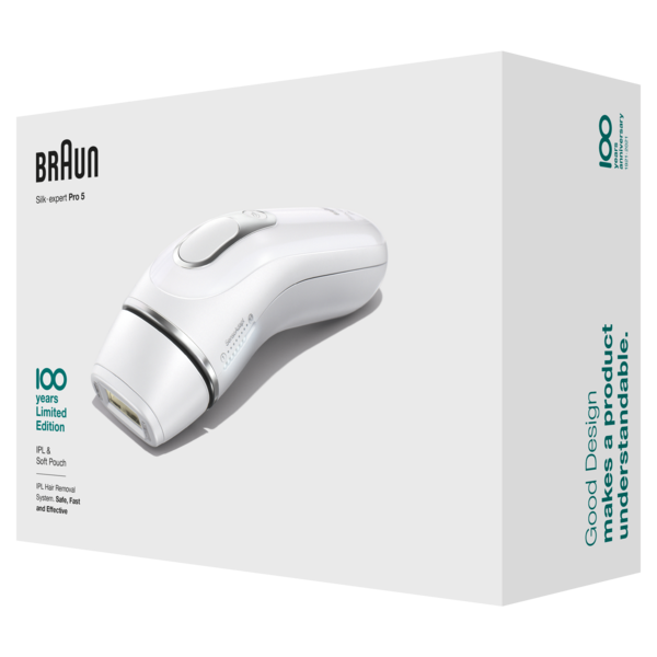 Na oslavu storočného výročia značky Braun bola vytvorená špeciálna edícia z niektorých najúspešnejších produktov, vrátane najlepšieho prístroja IPL značky Braun: Silk-expert Pro 5. Tento systém odstraňovanie chĺpkov pre ženy stelesňuje filozofiu značky Braun: dobrý dizajn nadovšetko. Senzor SensoAdapt automaticky prispôsobuje činnosť prístroja tónu vašej pokožky. Tri stupne šetrnosti zabezpečujú komfort vašej pokožky a 400 000 zábleskov je zárukou viditeľného odstránenie chĺpkov. Jednoduchý. Užitočný. Odolne konštruovaný.