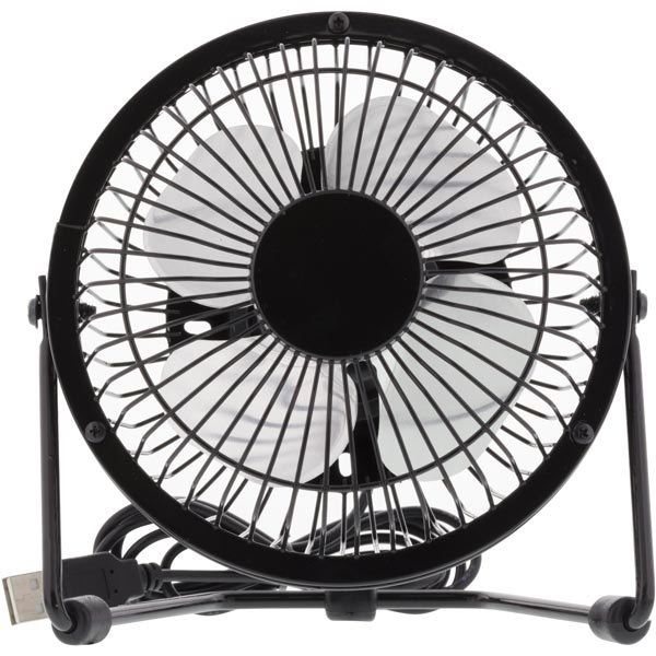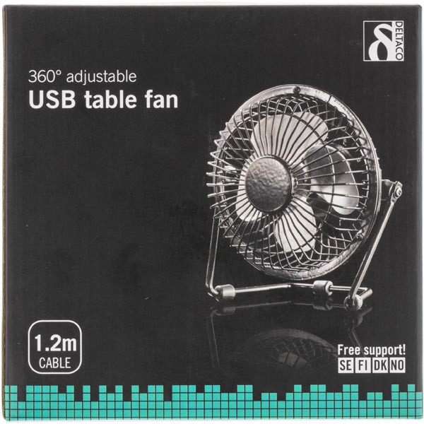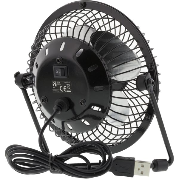 Stolný ventilátor s napájaním cez USB. Rozmery 150x81x154 mm, priemer vrtule 10 cm, výkon 2,5W. Dĺžka USB kábla 1,2 metra.