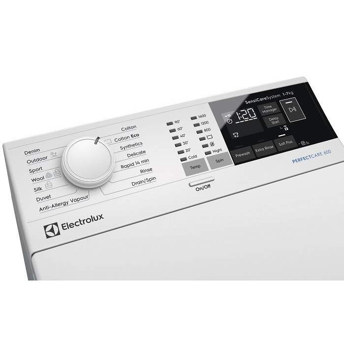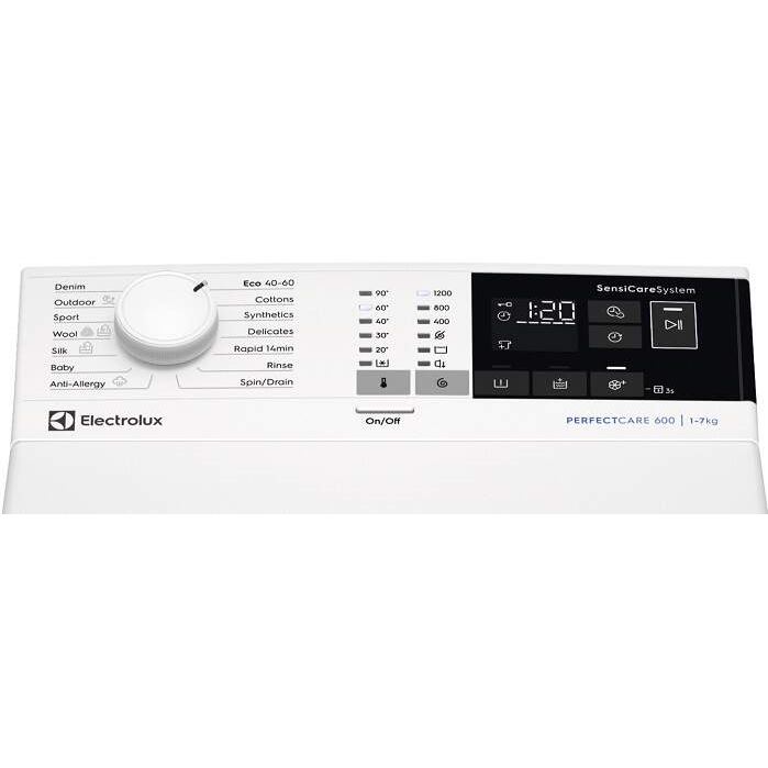 Zvrchu plnená práčka Electrolux EW6TN4272, vyperie 7 kg bielizne, energetická trieda E, 1200 otáčok za minútu, 15 pracích programov, program Anti-Allergy, spotreba 41 l na cyklus, systém SensiCare, funkcia SoftPlus, technológia Eco TimeManager, biela farba, odložený štart, pomalé otváranie dvierok, hluk pri odstreďovaní 77 dB, rozmery (VxŠxH): 89 x 40 x 60 cm