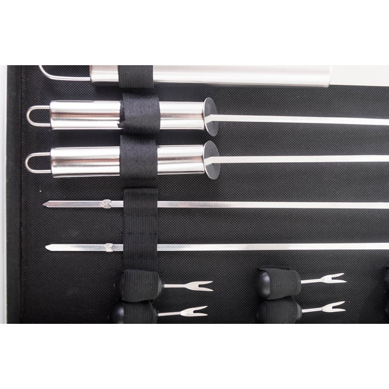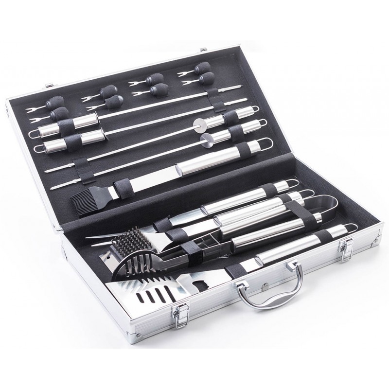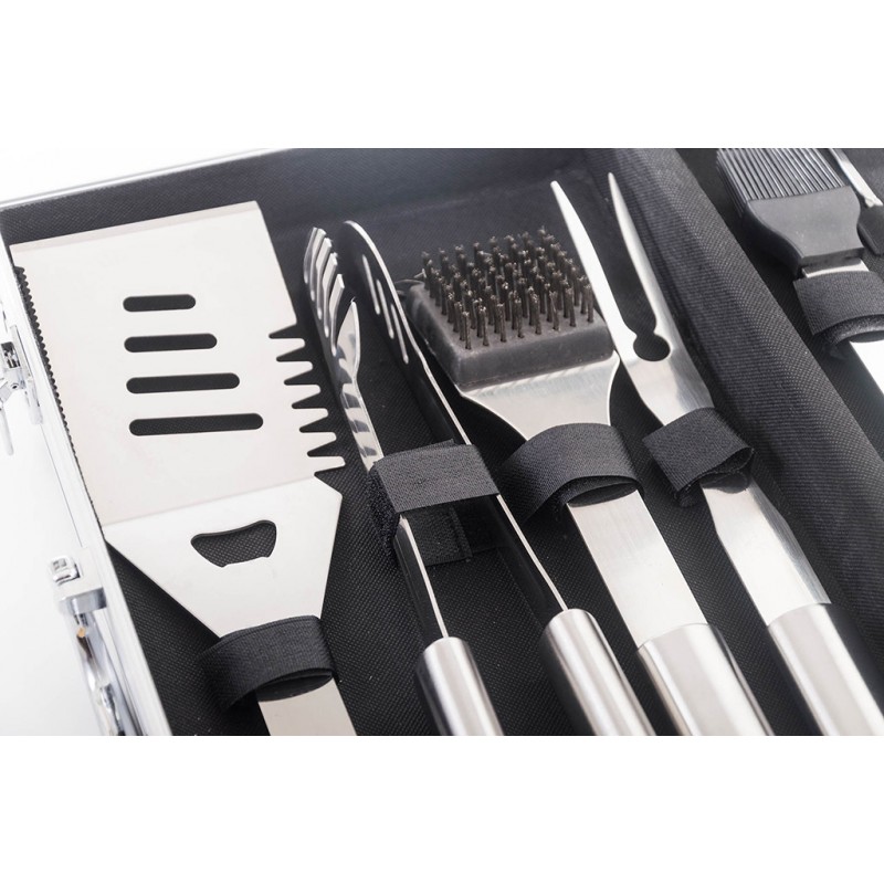 obsahuje kompletné nástroje pre grilovanie. Súčasťou sady je obracačka,
