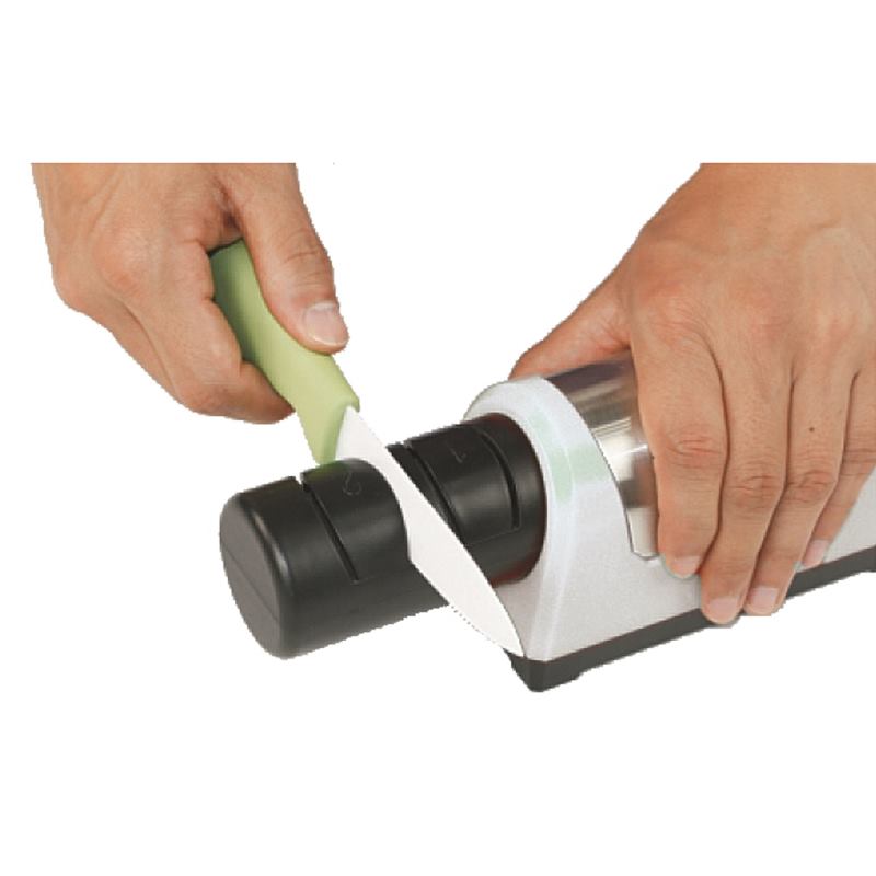 Elektrická diamantová brúska je určená na brúsenie oceľových aj keramických nožov. 4 diamantové brusné kotúče zaručujú efektívne a kvalitné brúsenie na dlhý čas. Správny uhol a rovnomerný tlak vytvarujú perfektné ostrie. Kryt z nerezovej ocele podčiarkuje nadčasový dizajn a ľahko sa čistí