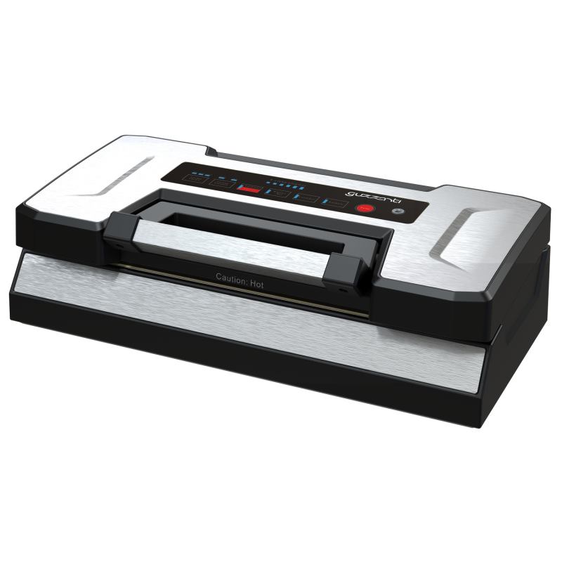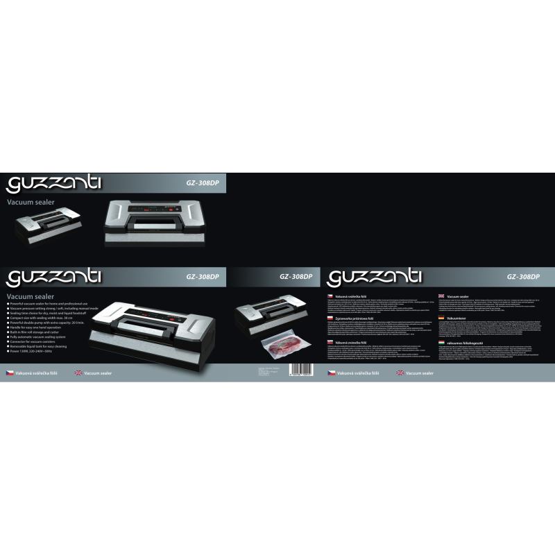 Vákuová zváračka fólií Guzzanti GZ 308DP – Moderný vzhľad a luxusná povrchová úprava z kartáčovanej nerezovej ocele, mpaktné rozmery umožňujúce prácu s vreckami až do šírky 30 cm, Veľmi výkonná, dvojitá pumpa s mimoriadnym sacím výkonom 20 l/min., Dosahuje podtlak až 0,9 bar, Veľmi pevný dvojitý zvar so šírkou 2,5 mm, Rukoväť pre ľahkú obsluhu jednou rukou