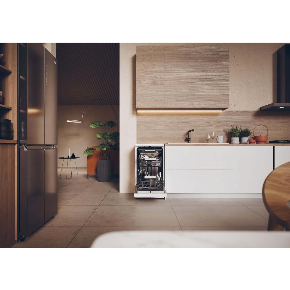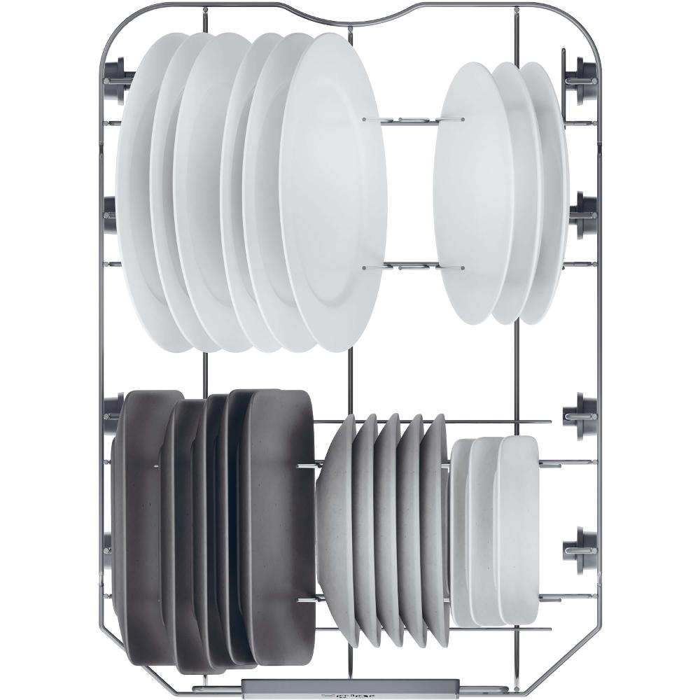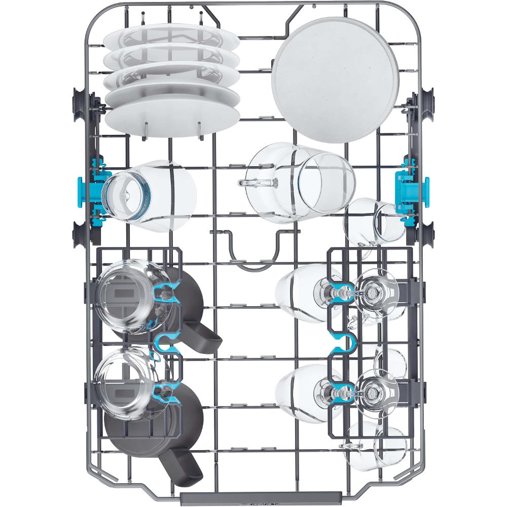 Výklopné držiaky šálky v hornom koši, Odkladacia plocha pre poháre na víno; Polohovanie horného koša; Plne sklopiteľné držiaky na taniere v spodnom a hornom koši