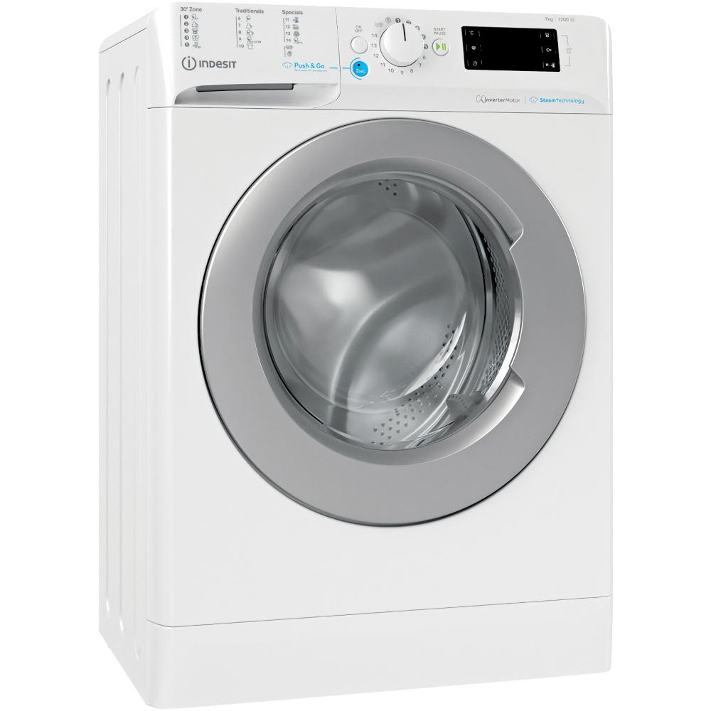 Spredu plnená práčka,Kapacita: 7 kg, Farba: biela, Farba dverí: strieborná,Automatické programy, Variabilná rýchlosť odstreďovania, Kontrola peny, Kontrola rozloženia hmotnosti bielizne, Pranie pri nízkej teplote, Zobrazenie prevádzkových fáz, Možnosti oneskoreného štartu, Objem bubna: 48 l, Trieda energetickej účinnosti: B,Spotreba energie na 100 umývacích cyklov: 52 kWh, Spotreba vody na cyklus: 46 l, počet otáčok: 1200 ot./min, Učinnosť odstredovania: B, Hlasitosť: 78 db, Rozmery a hmotnosť: Výška: 85 cm, šírka: 59,5 cm, Hĺbka: 43,5 cm