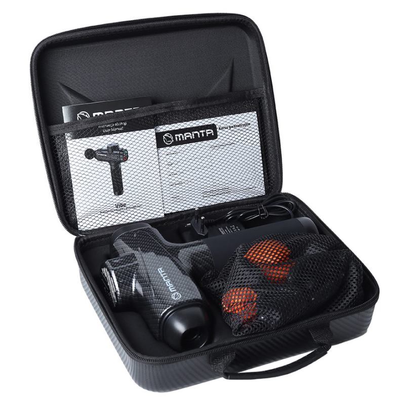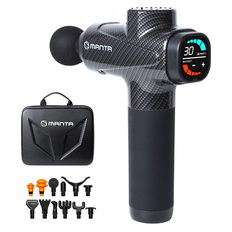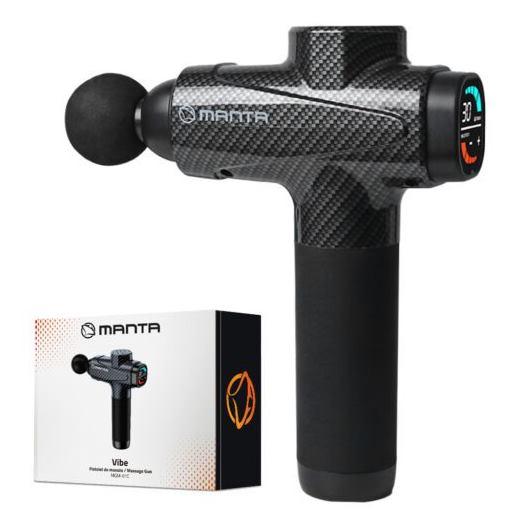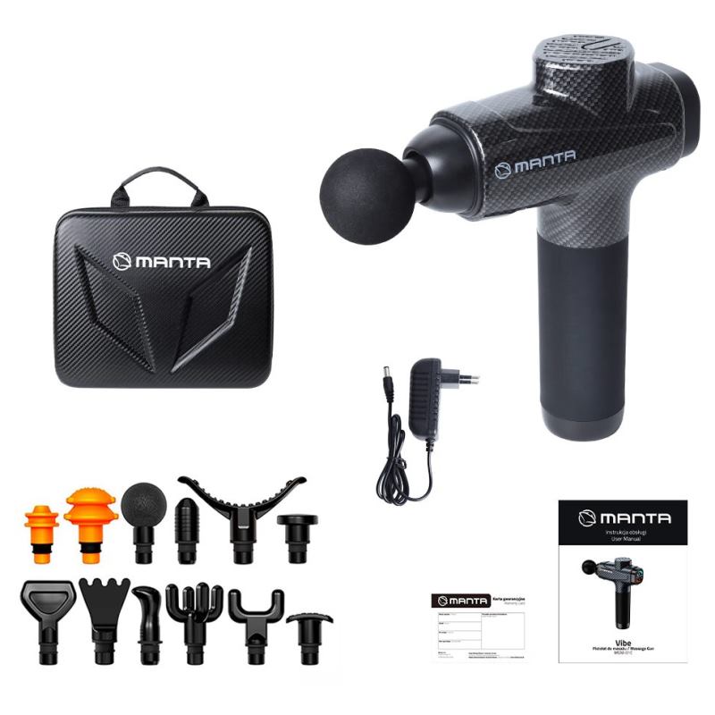 MANTA MGM-01C Vibe, Masážna pištoľ – 12 vymeniteľných masážnych koncoviek, praktický kufrík na prenášanie, tichý motor a batéria s vysokou kapacitou, 30 nastavení rýchlosti a indikátor tlaku, nabíja sa priloženým AC adaptérom, výkon: 100W, doba nabíjania: 3-4h, max. výdrž batérie: 2-5h