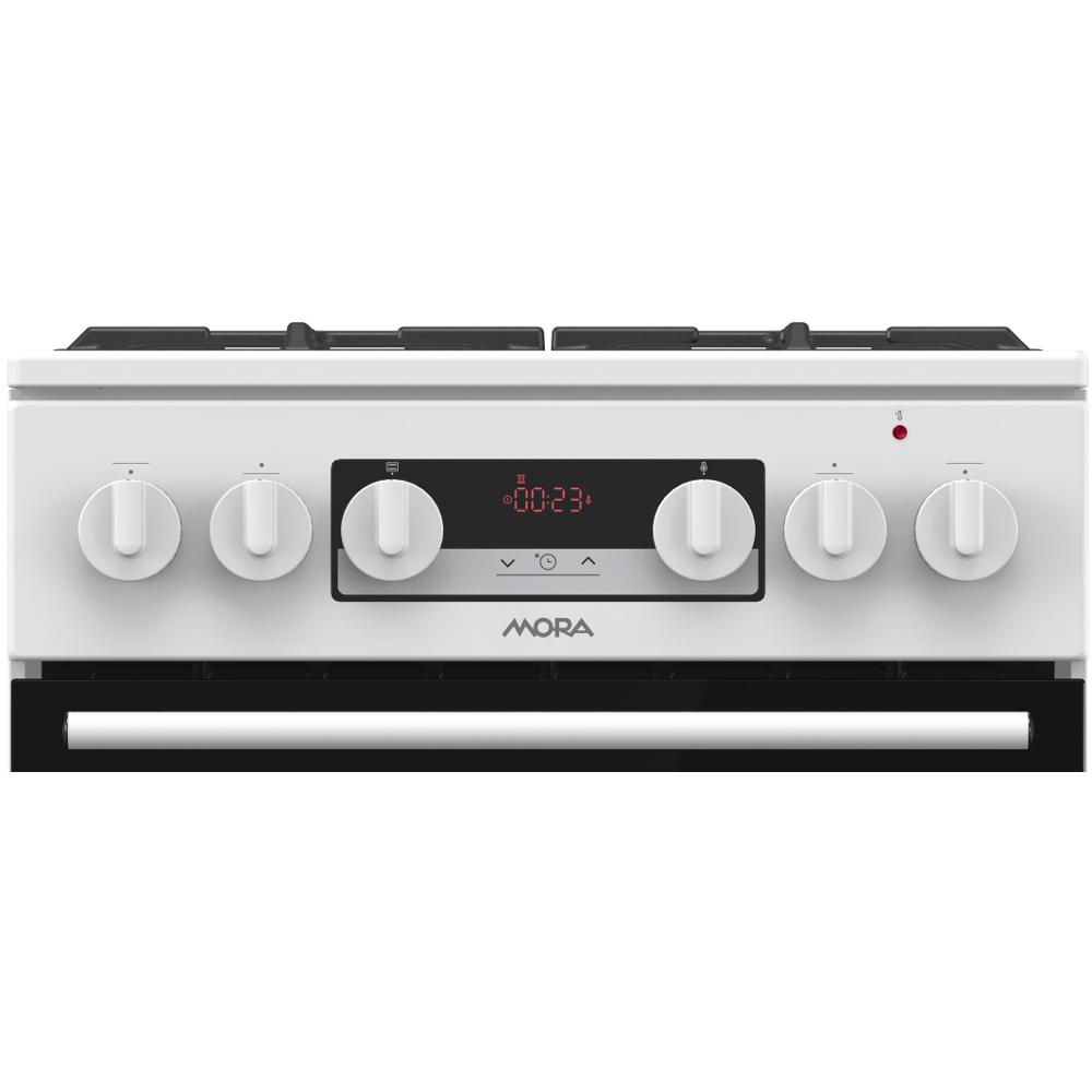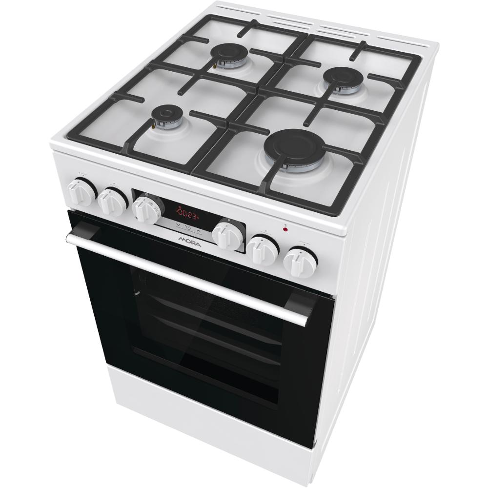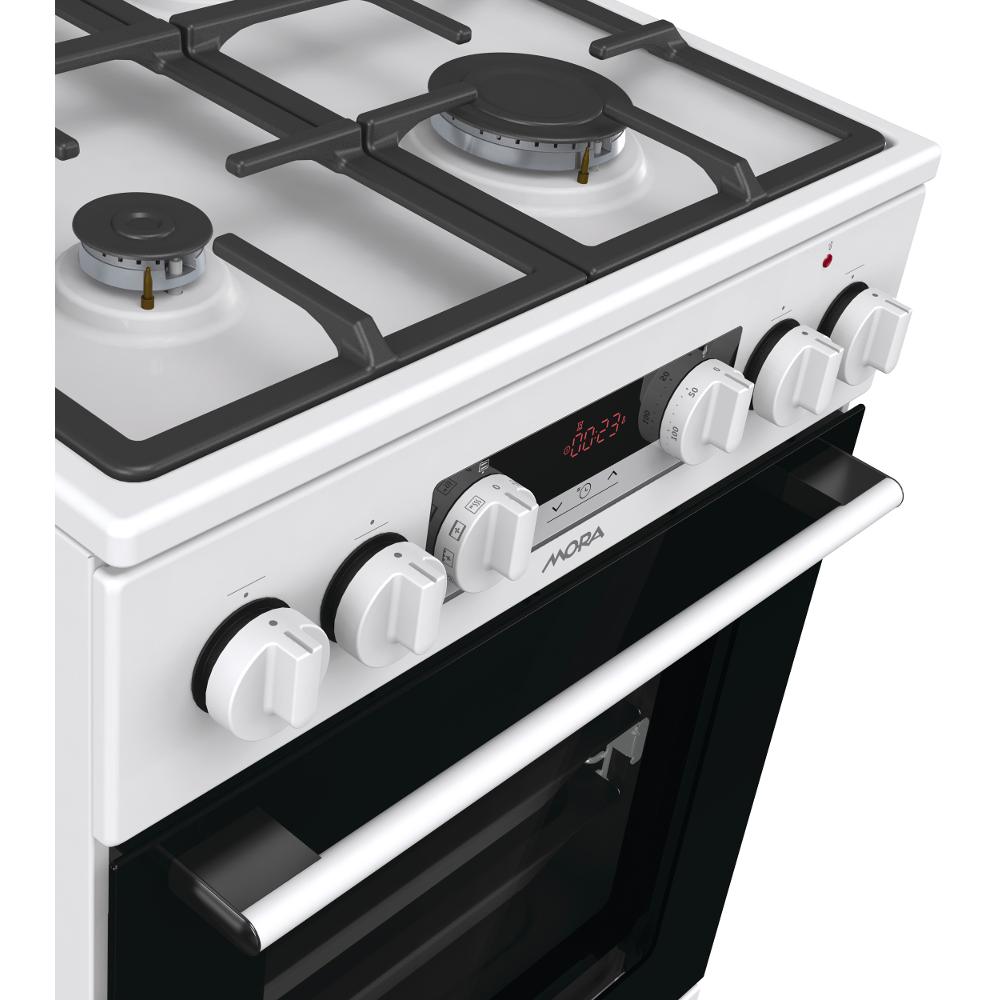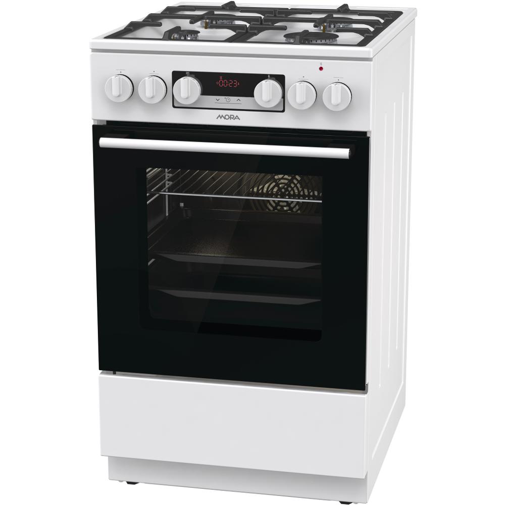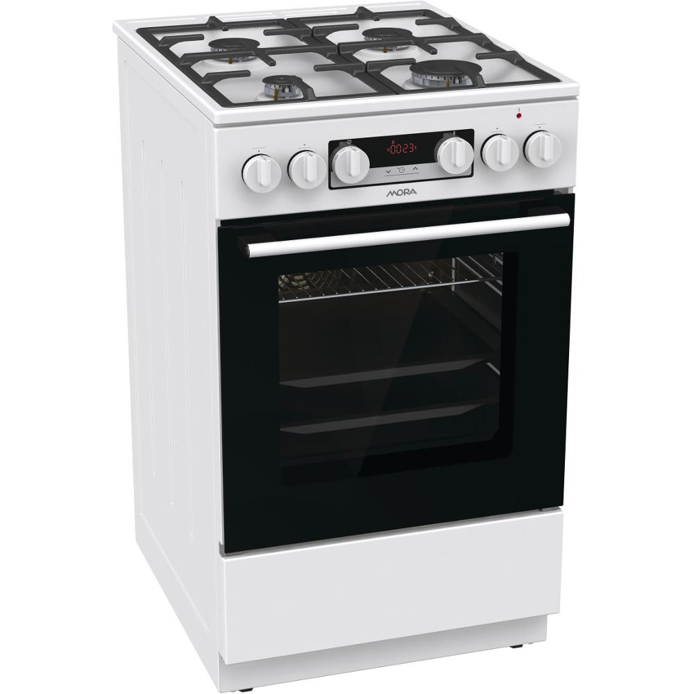 Kombinovaný sporák, MORA K 8668 B1W, Objem rúry 70 l, Energetická trieda – A, Menovitý príkon: 3,3 kW, Elektrické napätie: 230 V, Vľavo vpredu Ø 5,4 cm, 1 kW, Vpravo vpredu Ø 9,9 cm, 3 kW, Vľavo vzadu Ø 7,4 cm, 1,9 kW, Vpravo vzadu Ø 7,7 cm, 1,9 kW, 4 plynové horáky s poistkami STOP GAS, LIATINOVÁ dvojdielna mriežka STABIL PLUS, INTEGROVANÉ zapaľovanie horákov, DIGITÁLNY dotykový časový spínač s hodinami, Programovanie doby pečenia, Multifunkčná rúra – 11 spôsobov ohrevu, Rýchly predohrev rúry, EXTRA PARA – 2 programy pečenia v pare, Program PIZZA, Program pre HOTOVÉ A MRAŽENÉ JEDLÁ, Program HORKOVZDUŠNÉ FRITOVANIE BEZ TUKU, ECO CLEAN – funkcia na čistenie rúry, Regulácia teploty v rúre 50–275 °C, Osvetlenie rúry, Vedenie v rúre – drôtené vodítka plechov, Výsuvné teleskopické rošty / 1 úroveň, Tlmené dovieranie dvierok, Chladné dvierka rúry, Praktický úložný priestor, Príslušenstvo:, 1x rošt, 1x XXL hlboký pekáč, 1x plytký plech, Rozmery spotrebiča, (v x š x h): 85 × 50 × 59,4 cm