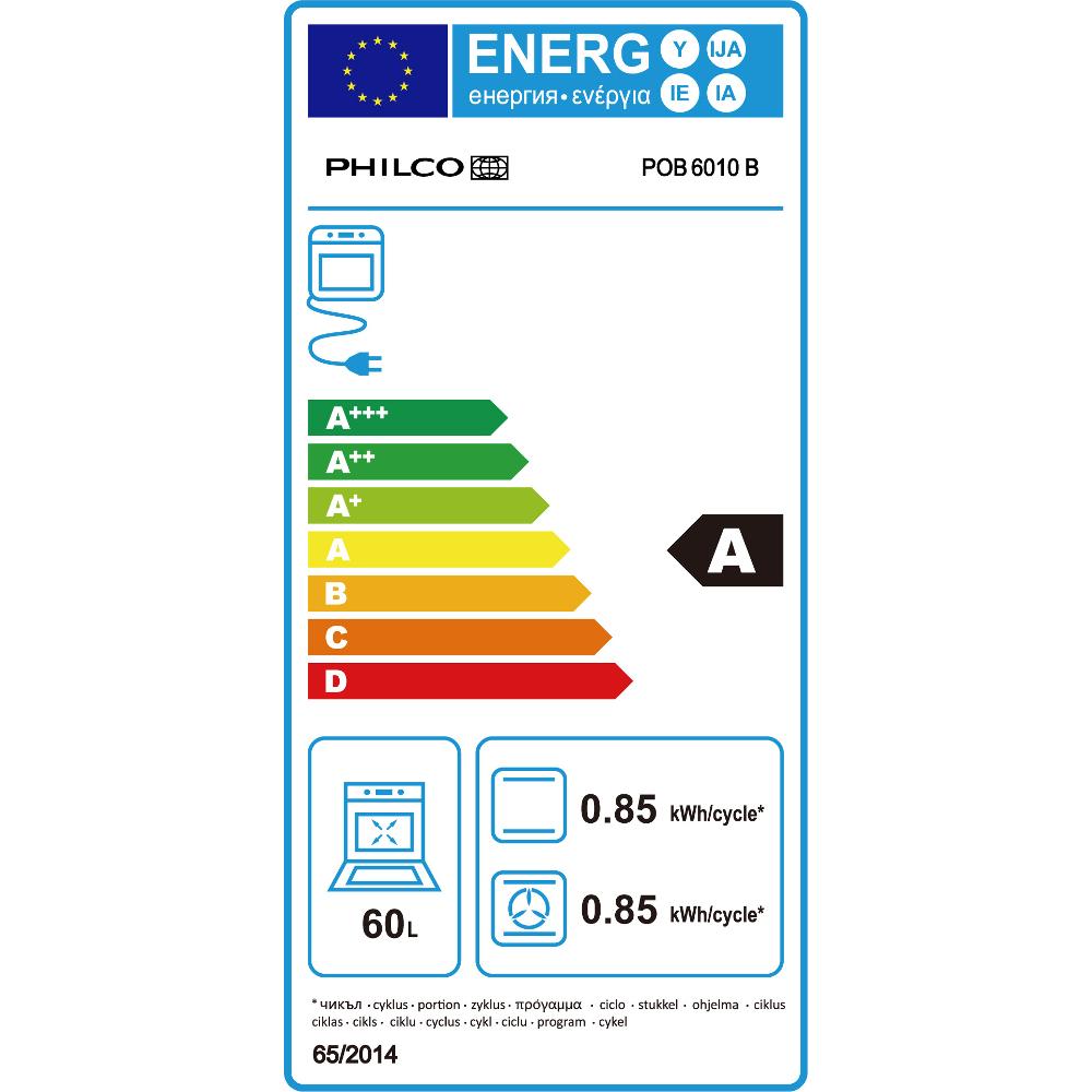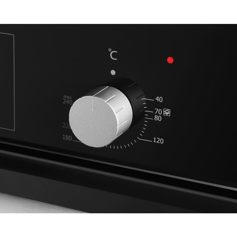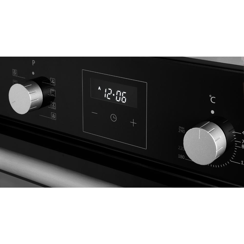 Vstavaná rúra, Objem 60 litrov, Teplota 40 – 240°C, Mechanické ovladanie s kombináciou dotykovým ovládaním časovača, 8 programov, Minútka, Biely displej, Ochladzovací ventilátor, veľkoplošný gril a Turbo gril, 5 pozícií pre nastavenie plechov, Rošt, Plytký plech (45,5x38x3,5 cm), Extra hlboký plech o objeme až 8 litrov, Teleskopický výsuv 1x (70%), Katalytická doska, Trojnásobné presklenie dverí, Povrch proti odtlačkom prstov, Rozmer v/š/h/ 595 x 595 x 575mm, Rozmery pre vstavanie (V x Š x H) 59-60 x 56 x 55 cm, Príkon 2400 W, Energetická trieda A, Farba čierna, Index energetickej účinnosti 106, Spotreba energie na cyklus pre pečúci priestor (v režime s prirodzenou konvenkciou) 0,85 kWh/cyklus, Spotreba energie na cyklus pre pečúci priestor (v režime s nútenou konvenkciou vzduchu) 0,85 kWh/cyklus