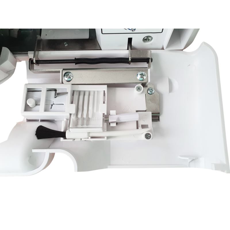 a alebo 2 niťami. Obrubuje, orezáva a šije v jedinom kroku, elektronicky