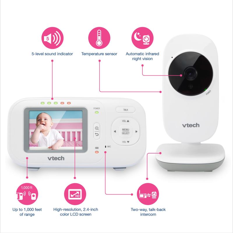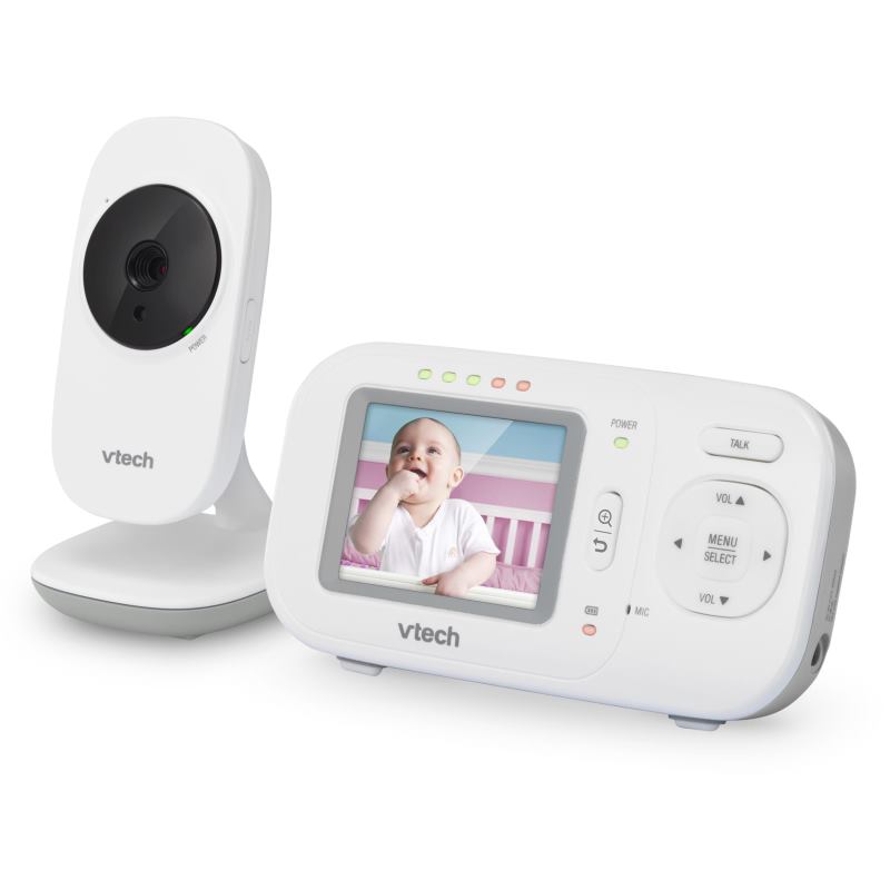Detská digitálna „video“ pestúnka s 2.4″ LCD farebným displejom, vnútorný dosah až 50m, vonkajší dosah 300m, rodičovská jednotka na akumulátor, detská jednotka na adaptér, obojsmerná komunikácia, infračervené nočné videnie (Rodičovská jednotka je napájaná nabíjateľnou Ni batériou, môžete ju ale mať spustenú aj na adaptéry)