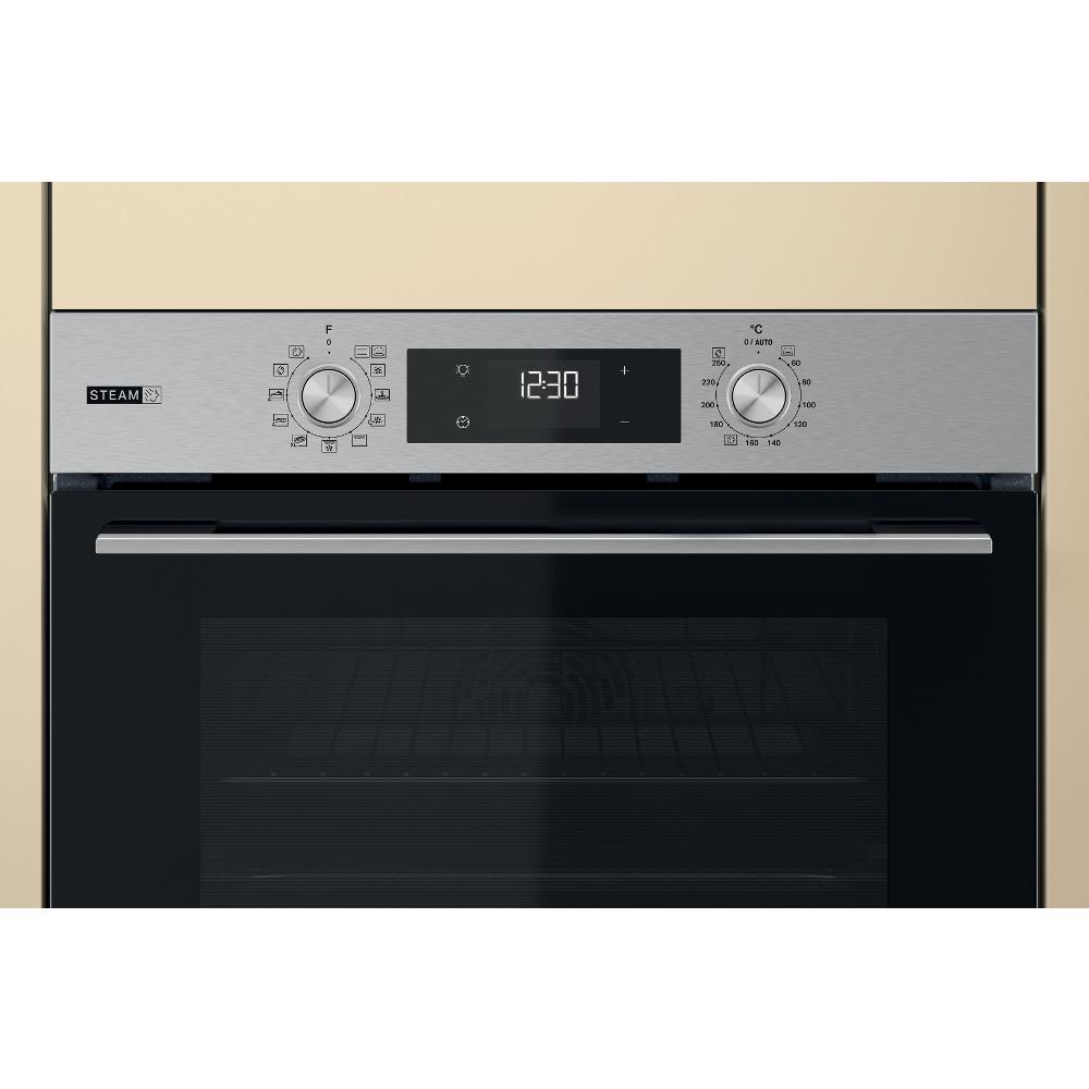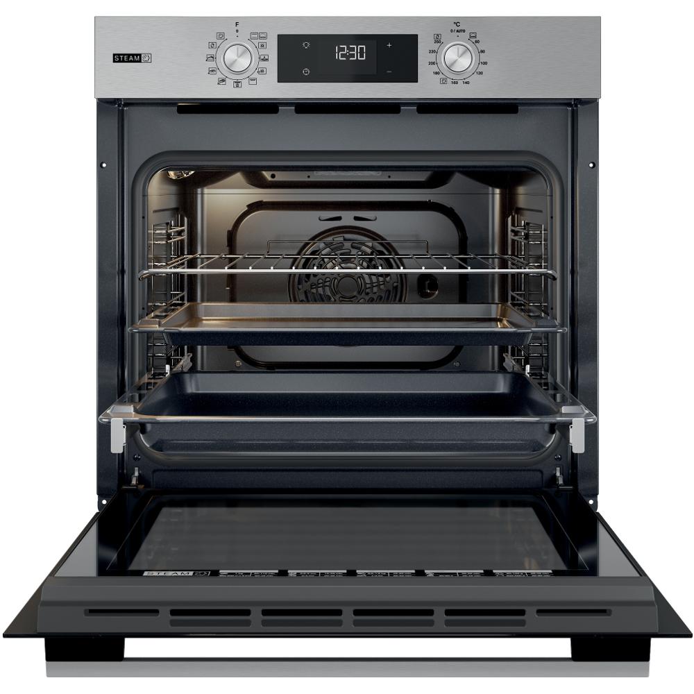 Multifunkčná teplovzdušná rúra, čierno-biely grafický displej, trojité sklo dverí, ovládanie push gombíkmi, 8 základných funkcií + Auto programy, Konvekčný ohrev, Horúci vzduch, Gril, Turbo gril, Maxi pečenie, Pizza, Chlieb, Kysnutie, Hydroclean – jednoduché čistenie vnútorného priestoru a skla dverí, Cook3, prevedenie: nerez, čierne sklo dverí, príslušenstvo: teleskopické výsuvy, 1x rošt, 2x plech na pečenie