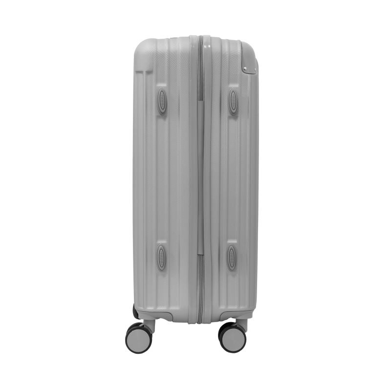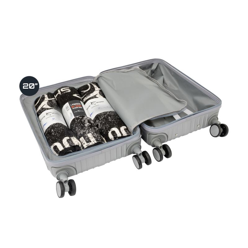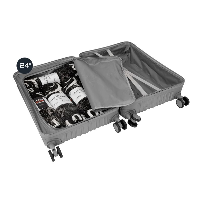 Sada kufrov na kolieskach v šedej farbe s brandingom White Shark, rozmery kufrov (mm): 1. 570x340x215 (20“) / 2. 665x245x400 (24“), materiál: ABS + PC. 1 hlavná priehradka + vnútroné vrecko na zips, možnosť zabezpečenia 3-číselným kódom, teleskopická rukoväť